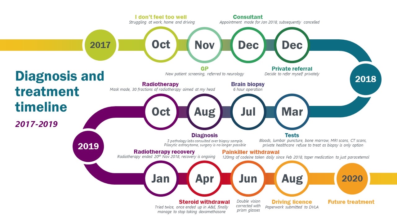 As a result, though, it can jump around a bit and seem confusing. So I’ve done a timeline to help me remember what’s happened and hopefully make sense to readers. If you’ve got a brain tumour, you’ll easily recognise these steps.